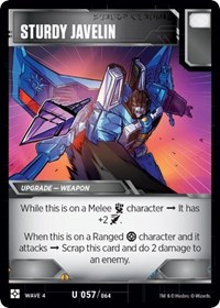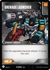 There are 2 actions and 2 upgrades. All 4 cards are powerful. This is a worst-case scenario. Simply splitting Action and Upgrades signals that you are about to take 2 turns under some incredible pressure. This pile hinges mostly on which turn it is. If this is Perceptor’s first flip trigger, that means that Showing Off is going to grant even more problems in the upcoming turns. Whether they started with a Showing Off (if they were second) or just flip back to alt mode if they went first, they will be able to have a hefty attack in Body mode in 2 turns. If they were second and have used Showing Off for their action, you are able to be safe from an immediate flip this turn, and their first attack will not be powered up by an action or upgrade. Peace is going to likely be stocked for a future turn, but you will now be able to plan for it (hopefully). Javelin is also likely a stockpile upgrade where grenade launcher is more of an immediate threat.