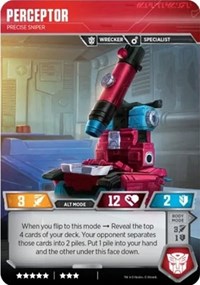 There is basically only one function that he will serve for you and that is to utilize his flip back to Alt mode. This flip is incredibly powerful and will completely change how you build your battle deck. You will have access to more cards than you have ever had before; effectively usurping Optimus Prime Battlefield Legend’s status as having the best flip in the game. You will ALWAYS get the card that you want from the top 4 cards. There is no way around it. Great for Perceptor and disheartening for the opponent. So, what happens with the cards that you choose not to take?